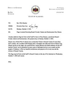 Flag Memo for Russell County Veteran and Businessman Roy Greene