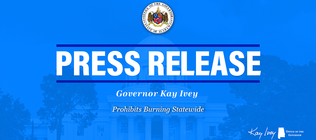 MONTGOMERY – Governor Kay Ivey on Wednesday issued a statewide ‘No Burn Order.’ Today, she signed a statewide Drought Emergency Declaration – often referred to as a ‘No Burn Order’ – prohibiting all outdoor burning in Alabama. This order is … Continue reading Governor Ivey Prohibits Burning Statewide