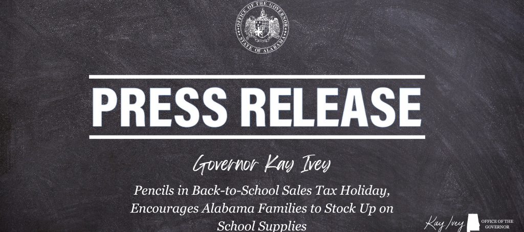 MONTGOMERY – Governor Kay Ivey on Monday encouraged Alabamians to begin preparing for the upcoming academic year by participating in Alabama’s annual Back-to-School Sales Tax Holiday, held Friday, July 19 through Sunday, July 21. “Alabama families, it’s that time of … Continue reading Governor Ivey Pencils in Back-to-School Sales Tax Holiday, Encourages Alabama Families to Stock Up on School Supplies