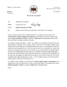Governor Ivey Flag Lowering Directive for Shooting Victim Ella Cook of Alabama