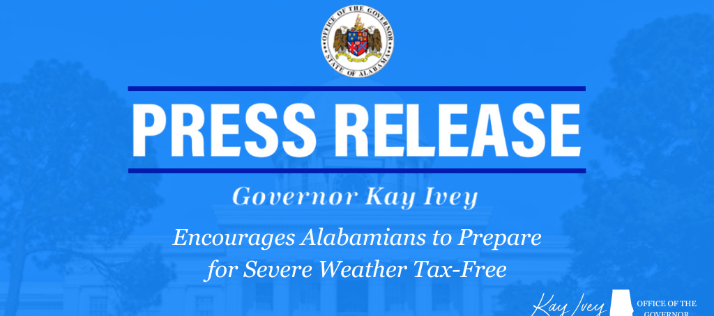 MONTGOMERY – With Alabama’s spring tornado season fast approaching, Governor Kay Ivey on Friday encouraged families and businesses across the state to take advantage of a tax-free opportunity to prepare. Alabama’s annual Severe Weather Preparedness Tax Holiday will take place … Continue reading Governor Ivey Encourages Alabamians to Prepare for Severe Weather Tax-Free
