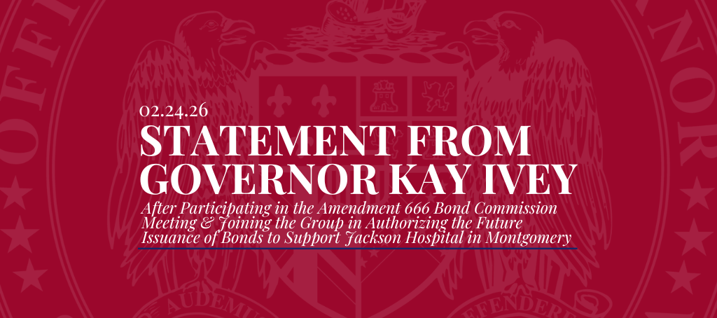 MONTGOMERY – Governor Kay Ivey on Tuesday participated in the Amendment 666 Bond Commission meeting and joined the group in authorizing the future issuance of bonds to support Jackson Hospital in Montgomery. Following the meeting this afternoon, Governor Ivey issued … Continue reading Governor Ivey Issues Statement on Her Support for Jackson Hospital