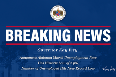 Governor Ivey Announces Alabama March Unemployment Rate Ties Historic Low of 2.9%, Number of Unemployed Hits New Record Low